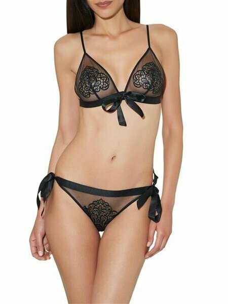 Conjunto de la colección exclusiva Boit a Desir de Aubade. Colección emocionante y seductora, modelos súper sexys de talla única, empaquetados en una pequeña caja con diseño elegante. Conjunto de lencería sexy. Sujetador sin aro y transparencias con tirante fino y lazo en el escote con encaje bordado en flor. Braguita con lazadas laterales de raso.